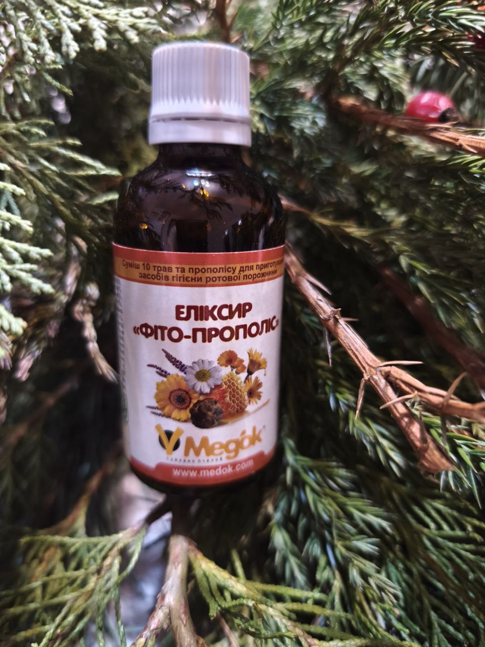 Крім прополісу, до складу еліксиру входять екстракти десяти лікарських рослин: