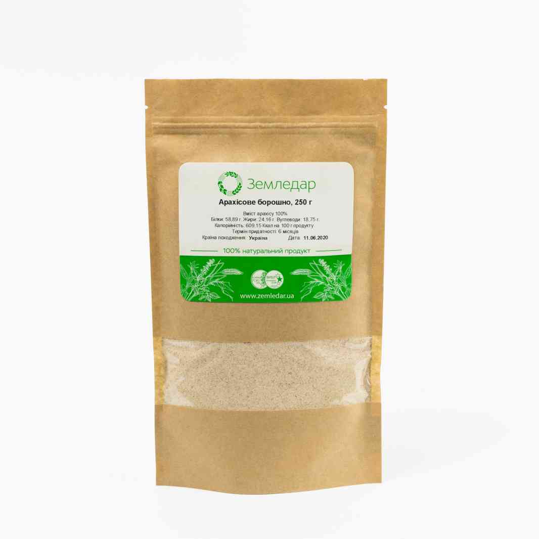 Перед виробництвом арахісового борошна сирі (необсмажені) ядра арахісу попередньо знежирюють. Воно досить калорійне і поживне, оскільки містить до 20% жирів. Характеризується ніжним арахісовим ароматом і великою кількістю білка у складі.