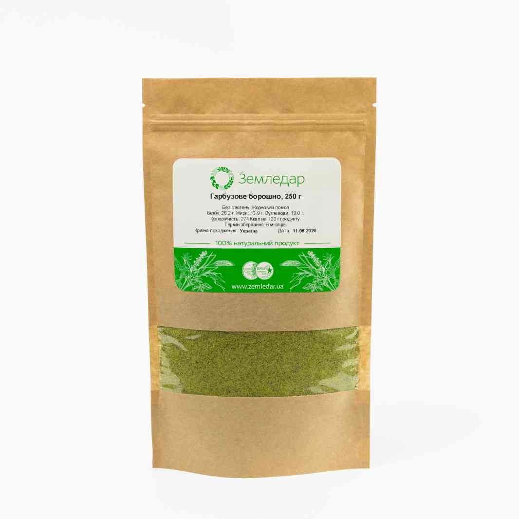 Гарбузове борошно готується зі знежиреного насіння гарбуза. Створює неповторний смак і відтінок стравам, принагідно насичуючи організм вітамінами, мінералами та рослинними волокнами. Так, 100 г гарбузового борошна здатні покрити добову потребу людини у міді та залізі, а всього 60 г – у фосфорі та магнії. Не містить глютен.