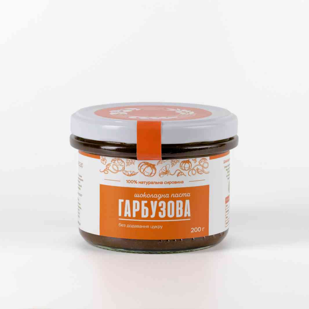 Шоколадна паста з додаванням меду та гарбузових продуктів – наш найнезвичайніший експеримент – не дуже солодка на смак, рідкувата за текстурою, з відчутними часточками клітковини та повністю натуральна за складом. Підійде для веганського раціону, дитячого столу та кулінарних експериментів.
