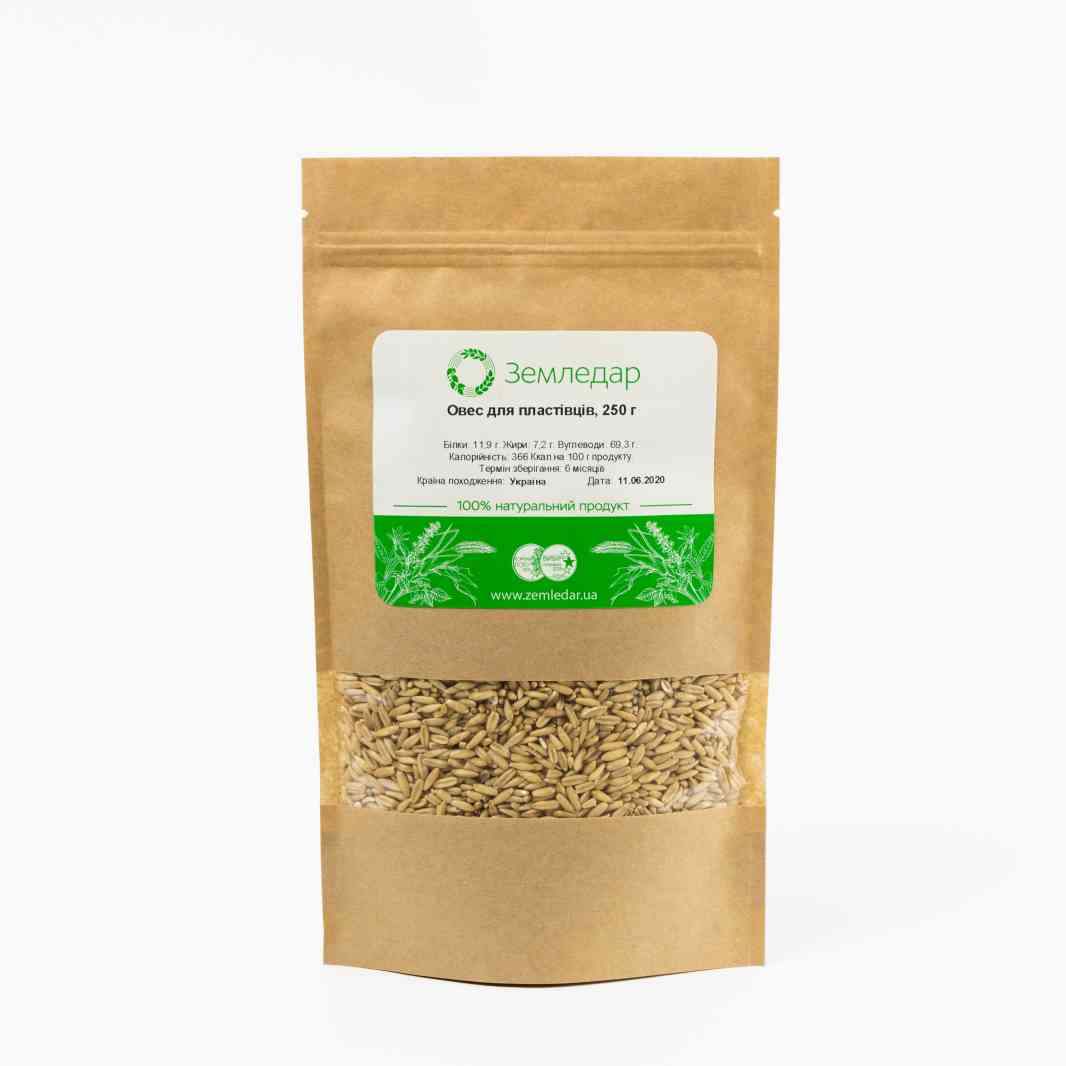 Зберігання. Продукт очищується та зберігається відповідно до санітарних норм, фасується у день замовлення. Покупець отримує свіжі вівсяні зерна з останнього врожаю.